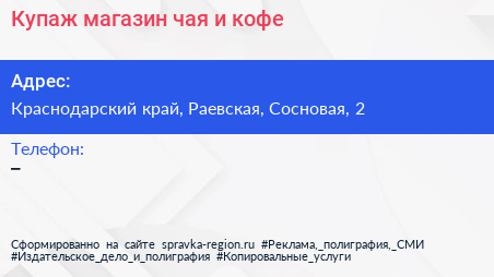 Купаж, магазин чая и кофе по адресу Краснодарский край, Раевская, Сосновая, 2 в дальнейшем Организация, размещена в следующих категориях: