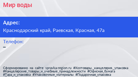 Мир воды по адресу Краснодарский край, Раевская, Красная, 47а в дальнейшем Организация, размещена в следующих категориях: