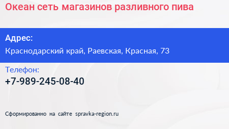 Океан, сеть магазинов разливного пива по адресу Краснодарский край, Раевская, Красная, 73 в дальнейшем Организация, размещена в следующих категориях: