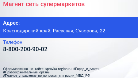 Магнит, сеть супермаркетов по адресу Краснодарский край, Раевская, Суворова, 22 в дальнейшем Организация, размещена в следующих категориях: