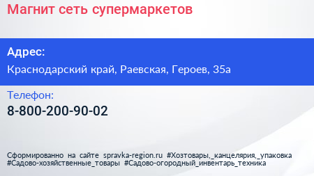 Магнит, сеть супермаркетов по адресу Краснодарский край, Раевская, Героев, 35а в дальнейшем Организация, размещена в следующих категориях: