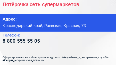 Пятёрочка, сеть супермаркетов по адресу Краснодарский край, Раевская, Красная, 73 в дальнейшем Организация, размещена в следующих категориях: