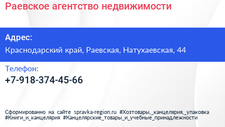 Раевское, агентство недвижимости по адресу Краснодарский край, Раевская, Натухаевская, 44 в дальнейшем Организация, размещена в следующих категориях: