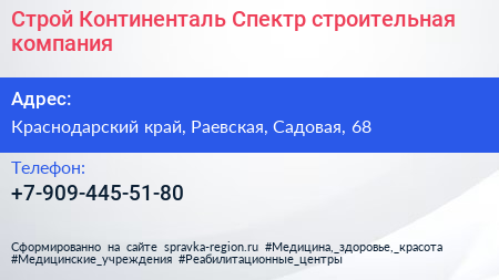 Строй Континенталь Спектр, строительная компания по адресу Краснодарский край, Раевская, Садовая, 68 в дальнейшем Организация, размещена в следующих категориях: