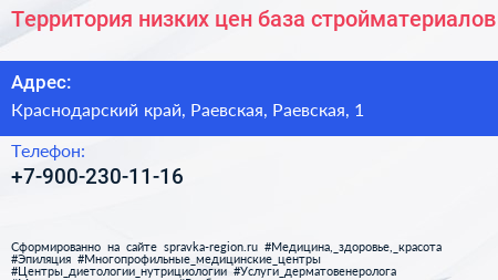 Территория низких цен, база стройматериалов по адресу Краснодарский край, Раевская, Раевская, 1 в дальнейшем Организация, размещена в следующих категориях: