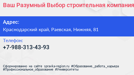 Ваш Разумный Выбор, строительная компания по адресу Краснодарский край, Раевская, Нижняя, 81 в дальнейшем Организация, размещена в следующих категориях: