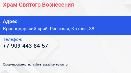 Храм Святого Вознесения по адресу Краснодарский край, Раевская, Котова, 38 в дальнейшем Организация, размещена в следующих категориях: