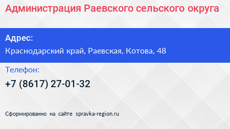 Администрация Раевского сельского округа по адресу Краснодарский край, Раевская, Котова, 48 в дальнейшем Организация, размещена в следующих категориях: