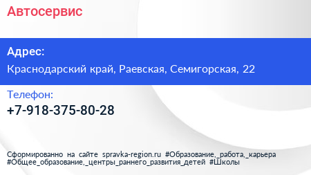 Автосервис по адресу Краснодарский край, Раевская, Семигорская, 22 в дальнейшем Организация, размещена в следующих категориях:
