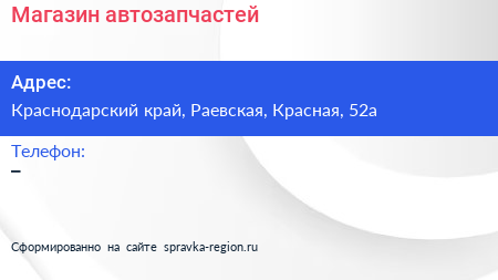 Магазин автозапчастей по адресу Краснодарский край, Раевская, Красная, 52а в дальнейшем Организация, размещена в следующих категориях: