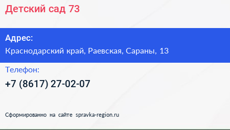 Детский сад №73 по адресу Краснодарский край, Раевская, Сараны, 13 в дальнейшем Организация, размещена в следующих категориях: