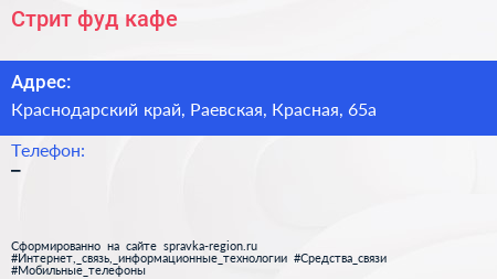Стрит-фуд кафе по адресу Краснодарский край, Раевская, Красная, 65а в дальнейшем Организация, размещена в следующих категориях: