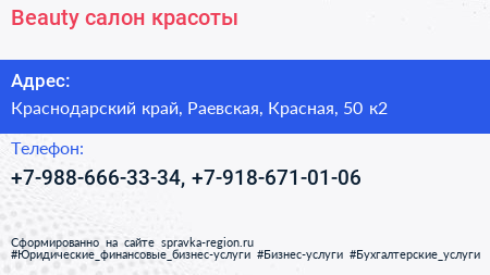 Beauty, салон красоты по адресу Краснодарский край, Раевская, Красная, 50 к2 в дальнейшем Организация, размещена в следующих категориях: