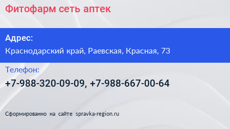 Фитофарм, сеть аптек по адресу Краснодарский край, Раевская, Красная, 73 в дальнейшем Организация, размещена в следующих категориях: