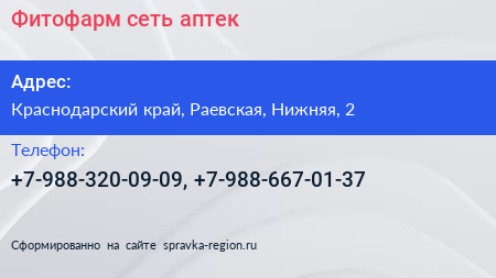 Фитофарм, сеть аптек по адресу Краснодарский край, Раевская, Нижняя, 2 в дальнейшем Организация, размещена в следующих категориях: