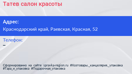Татев, салон красоты по адресу Краснодарский край, Раевская, Красная, 52 в дальнейшем Организация, размещена в следующих категориях: