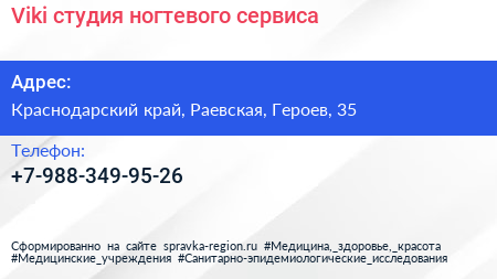 Viki, студия ногтевого сервиса по адресу Краснодарский край, Раевская, Героев, 35 в дальнейшем Организация, размещена в следующих категориях: