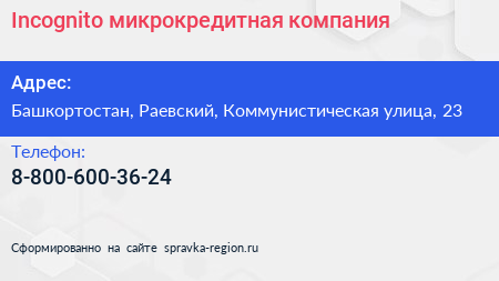 Incognito, микрокредитная компания по адресу Башкортостан, Раевский, Коммунистическая улица, 23 в дальнейшем Организация, размещена в следующих категориях:
