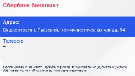 Сбербанк, банкомат по адресу Башкортостан, Раевский, Коммунистическая улица, 94 в дальнейшем Организация, размещена в следующих категориях: