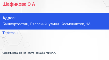 Шафикова Э.А. по адресу Башкортостан, Раевский, улица Космонавтов, 16 в дальнейшем Организация, размещена в следующих категориях: