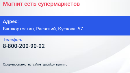 Магнит, сеть супермаркетов по адресу Башкортостан, Раевский, Кускова, 57 в дальнейшем Организация, размещена в следующих категориях: