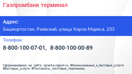 Газпромбанк, терминал по адресу Башкортостан, Раевский, улица Карла Маркса, 233 в дальнейшем Организация, размещена в следующих категориях:
