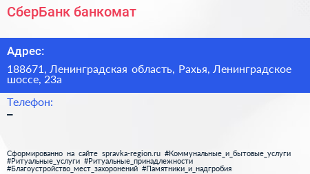 СберБанк, банкомат по адресу 188671, Ленинградская область, Рахья, Ленинградское шоссе, 23а в дальнейшем Организация, размещена в следующих категориях: