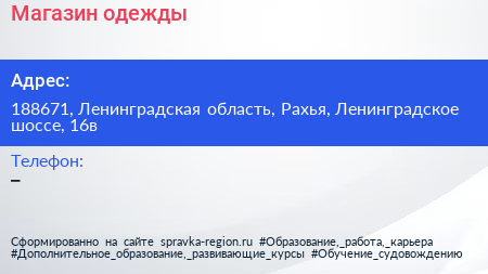 Магазин одежды по адресу 188671, Ленинградская область, Рахья, Ленинградское шоссе, 16в в дальнейшем Организация, размещена в следующих категориях: