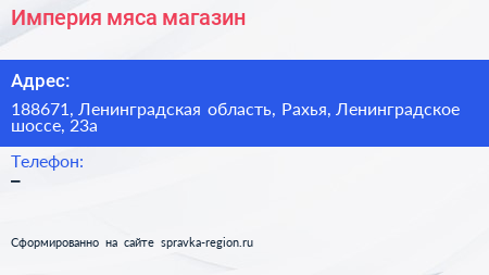 Империя мяса, магазин по адресу 188671, Ленинградская область, Рахья, Ленинградское шоссе, 23а в дальнейшем Организация, размещена в следующих категориях: