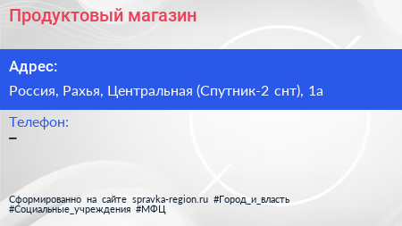 Продуктовый магазин по адресу Центральная улица, СНТ "Спутник - 2", Рахьинское городское поселение, Всеволожский район, Ленинградская область, Северо-Западный федеральный округ, 188671, Россия в дальнейшем Организация, размещена в следующих категориях: