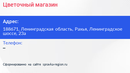 Цветочный магазин по адресу 188671, Ленинградская область, Рахья, Ленинградское шоссе, 23а в дальнейшем Организация, размещена в следующих категориях: