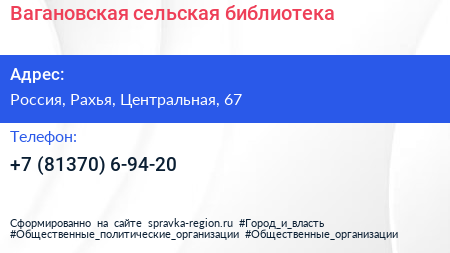 Вагановская сельская библиотека по адресу Магнит, Центральная улица, Борисова Грива, Рахьинское городское поселение, Всеволожский район, Ленинградская область, Северо-Западный федеральный округ, 188672, Россия в дальнейшем Организация, размещена в следующих категориях: