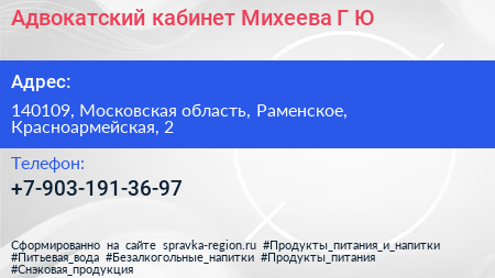 Адвокатский кабинет Михеева Г.Ю. по адресу 140109, Московская область, Раменское, Красноармейская, 2 в дальнейшем Организация, размещена в следующих категориях: