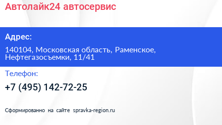 Автолайк24, автосервис по адресу 140104, Московская область, Раменское, Нефтегазосъемки, 11/41 в дальнейшем Организация, размещена в следующих категориях: