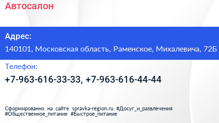 Автосалон по адресу 140101, Московская область, Раменское, Михалевича, 72Б в дальнейшем Организация, размещена в следующих категориях: