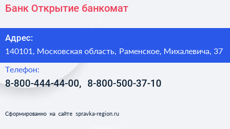 Банк Открытие, банкомат по адресу 140101, Московская область, Раменское, Михалевича, 37 в дальнейшем Организация, размещена в следующих категориях: