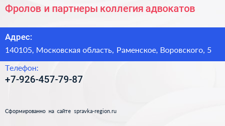 Фролов и партнеры, коллегия адвокатов по адресу 140105, Московская область, Раменское, Воровского, 5 в дальнейшем Организация, размещена в следующих категориях: