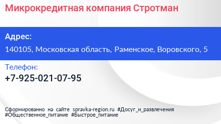 Микрокредитная компания Стротман по адресу 140105, Московская область, Раменское, Воровского, 5 в дальнейшем Организация, размещена в следующих категориях:
