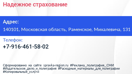 Надежное страхование по адресу 140101, Московская область, Раменское, Михалевича, 131 в дальнейшем Организация, размещена в следующих категориях: