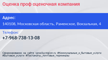 Оценка-проф, оценочная компания по адресу 140108, Московская область, Раменское, Вокзальная, 4 в дальнейшем Организация, размещена в следующих категориях: