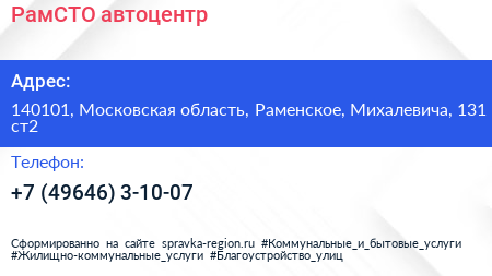 РамСТО, автоцентр по адресу 140101, Московская область, Раменское, Михалевича, 131 ст2 в дальнейшем Организация, размещена в следующих категориях: