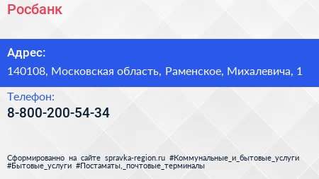 Росбанк по адресу 140108, Московская область, Раменское, Михалевича, 1 в дальнейшем Организация, размещена в следующих категориях: