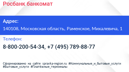 Росбанк, банкомат по адресу 140108, Московская область, Раменское, Михалевича, 1 в дальнейшем Организация, размещена в следующих категориях: