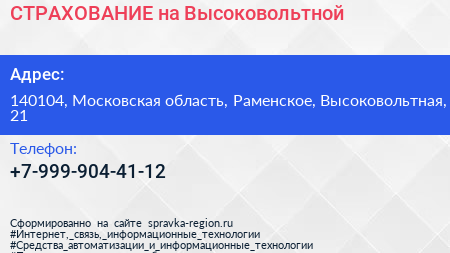 СТРАХОВАНИЕ на Высоковольтной по адресу 140104, Московская область, Раменское, Высоковольтная, 21 в дальнейшем Организация, размещена в следующих категориях:
