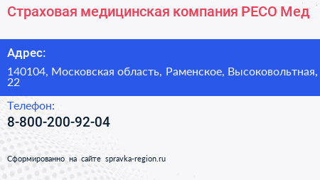 Страховая медицинская компания РЕСО-Мед по адресу 140104, Московская область, Раменское, Высоковольтная, 22 в дальнейшем Организация, размещена в следующих категориях: