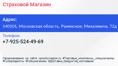Страховой Магазин по адресу 140101, Московская область, Раменское, Михалевича, 72д в дальнейшем Организация, размещена в следующих категориях: