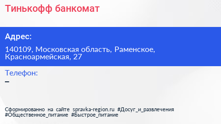 Тинькофф, банкомат по адресу 140109, Московская область, Раменское, Красноармейская, 27 в дальнейшем Организация, размещена в следующих категориях: