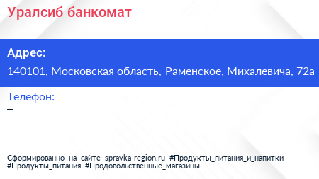 Уралсиб, банкомат по адресу 140101, Московская область, Раменское, Михалевича, 72а в дальнейшем Организация, размещена в следующих категориях: