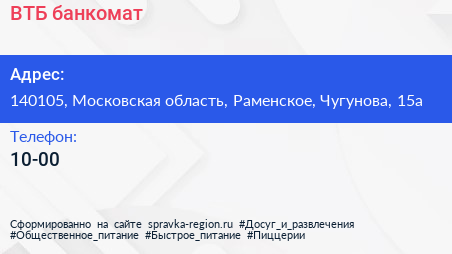 ВТБ, банкомат по адресу 140105, Московская область, Раменское, Чугунова, 15а в дальнейшем Организация, размещена в следующих категориях: