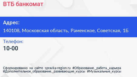 ВТБ, банкомат по адресу 140108, Московская область, Раменское, Советская, 1Б в дальнейшем Организация, размещена в следующих категориях:
